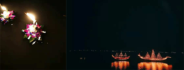 水燈是用象征著力量和財(cái)富的芭蕉葉折疊制成的,有的折成葵花狀,有的折成寶塔狀,折好的水燈上會(huì)插上鮮花和香燭,燃放爆竹之后,人們將香燭點(diǎn)燃,緩緩放入水中。剎那間,映著傾城月色,河面上燈火萬點(diǎn),忽遠(yuǎn)忽近,隨波漂蕩,蔚為壯觀。